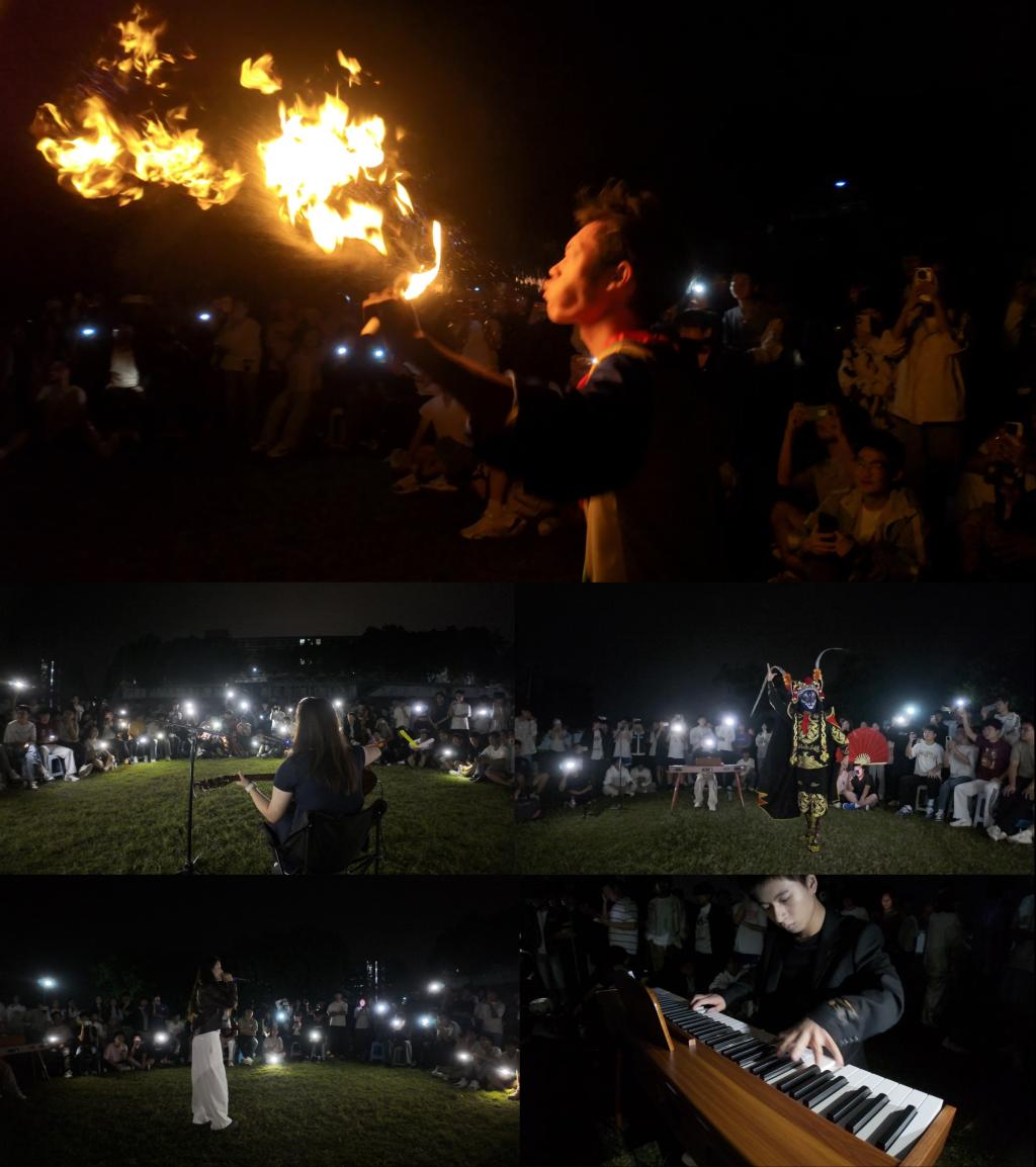 晚会持续近两小时,现场气氛热烈。夜幕降临后,在场观众自发点亮手机灯光,星光点点汇聚成暖意流动的海洋,呼应“绿茵逐光,青春一场”的主题,也成为晚会最具感染力的画面。