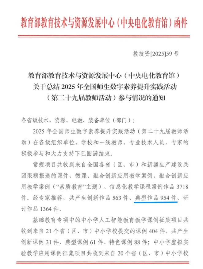 据悉,该活动是教育部为深入推动教育数字化战略行动、全面提升师生数字素养与技能而举办的国家级赛事,包括常规项目、基础教育专项、职业教育专项、高等教育专项、教师研修专项等。其中,常规项目共收到来自全国各省(区、市)和新疆生产建设兵团限额报送的课件、微课、融合创新应用教学案例、融合创新应用教学案例(“素质教育”主题)、信息化教学课程案例作品3718件。经专家推荐,共产生创新作品563件、典型作品954件、研讨作品1364件。我校报送的信息化教学课程案例经四川省教育厅选拔推荐,在全国评选中脱颖而出,获得常规项目高等教育组“典型作品”荣誉,这既是对项目团队专业能力的充分肯定,也是我校持续推进教育教学数字化转型的又一重要成果。