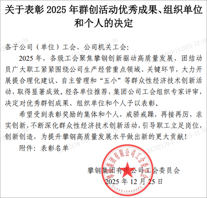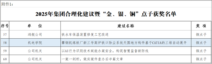 (智能制造学院刘登平)近日,攀钢集团有限公司工会委员会发布2025年群创活动表彰决定,智能制造学院刘登平、张成祥、高文明项目团队凭借一项技术创新成果,荣获2025年集团合理化建议暨“铜”点子奖。该成果为基于CATIA软件二次开发的钣金构件三维自动展开方法,已成功落地应用于攀钢钒炼铁厂新3#高炉铁口除尘系统,不仅高效解决了天圆地方构件生产难题,更为企业降本增效提供了有力支撑,成为集团合理化建议中“技术赋能生产”的典型案例。